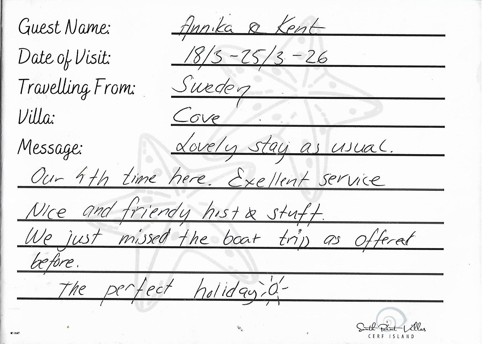 Read the handwritten guestbook entryOur 2nd visit definitely not last time here in Cove villa.
