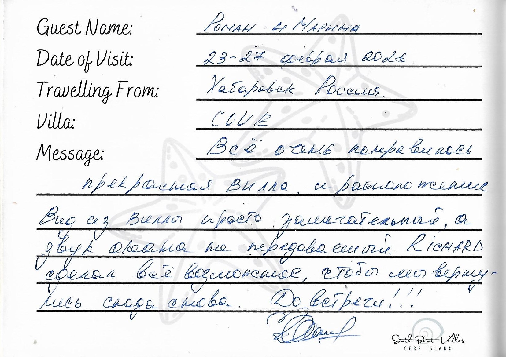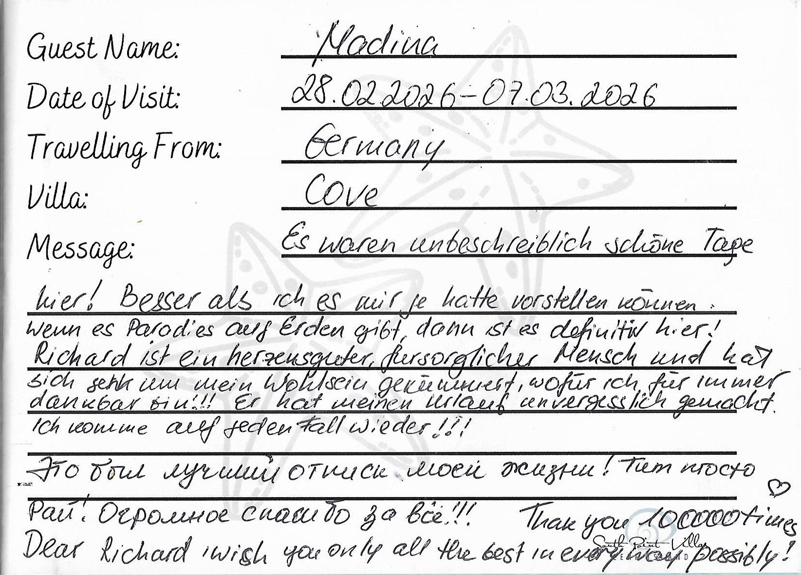 Read the handwritten guestbook entryWe enjoyed villa Cove - our little paradise - especially the peace and seclusion and the sea with all our senses.