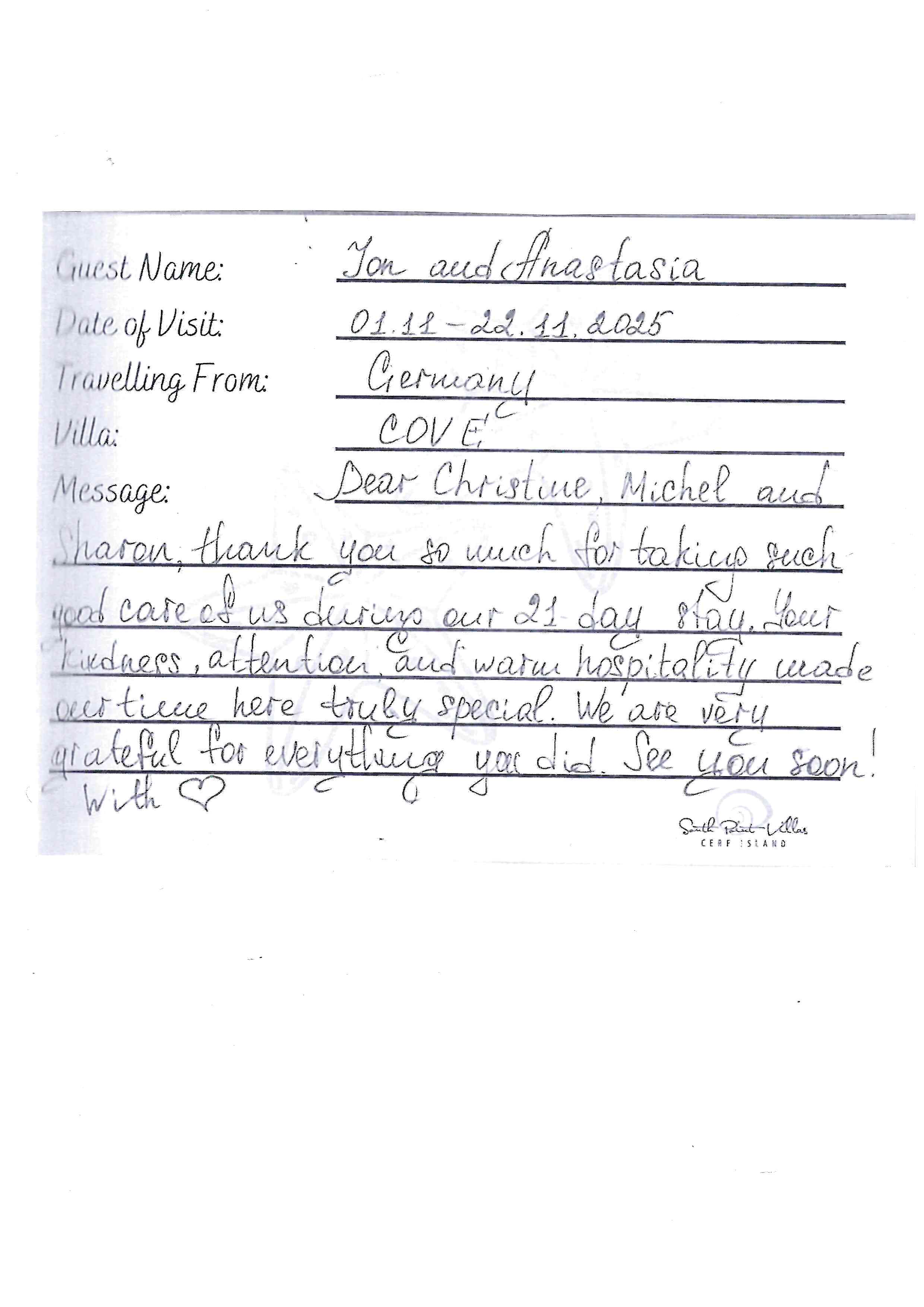Lire l'entrée manuscrite du livre d'orDear Christine, Michel a nd Sharon, thank you so much for taking such good care of us during our 21-day stay. Your kindness, attention, and warm hospitality made our time here truly special. We are very grateful for everything you did.
