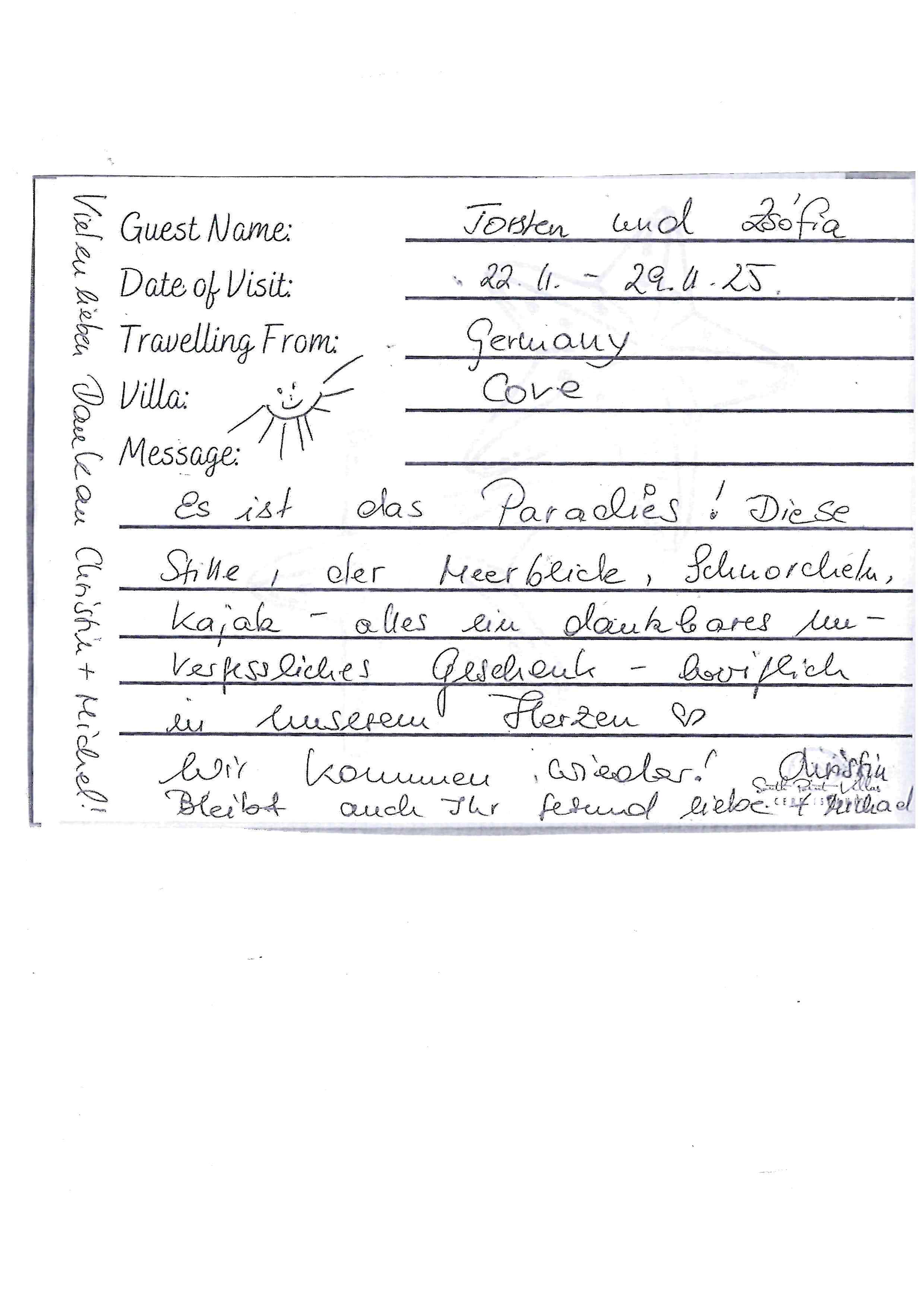 Lire l'entrée manuscrite du livre d'orThank you for three days in this little place of paradise!