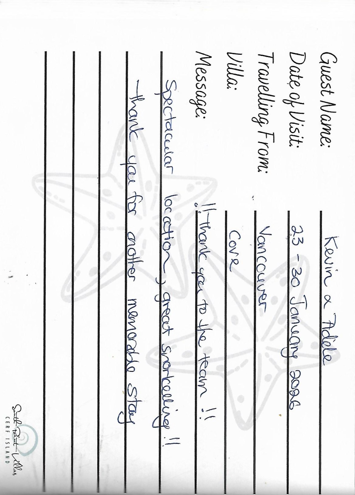Lire l'entrée manuscrite du livre d'orDear Christine and Michel, Cerf Island and the Southpoint villas were perfect for us! We really enjoyed our stay, the villa, the kayaks and the relaxing atmosphere. A big thank you for your awesome extra service after our wedding proposal!