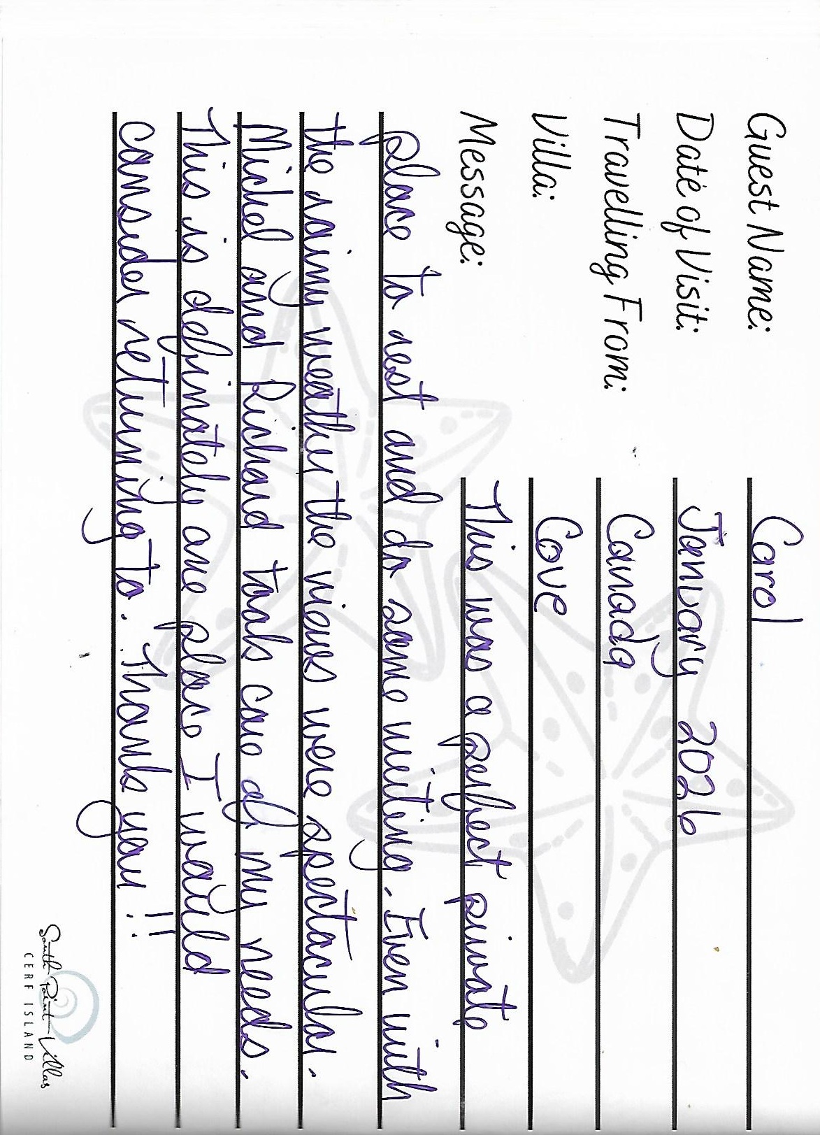 Lire l'entrée manuscrite du livre d'orOur first time at South Point Villas but hopefully not our last!