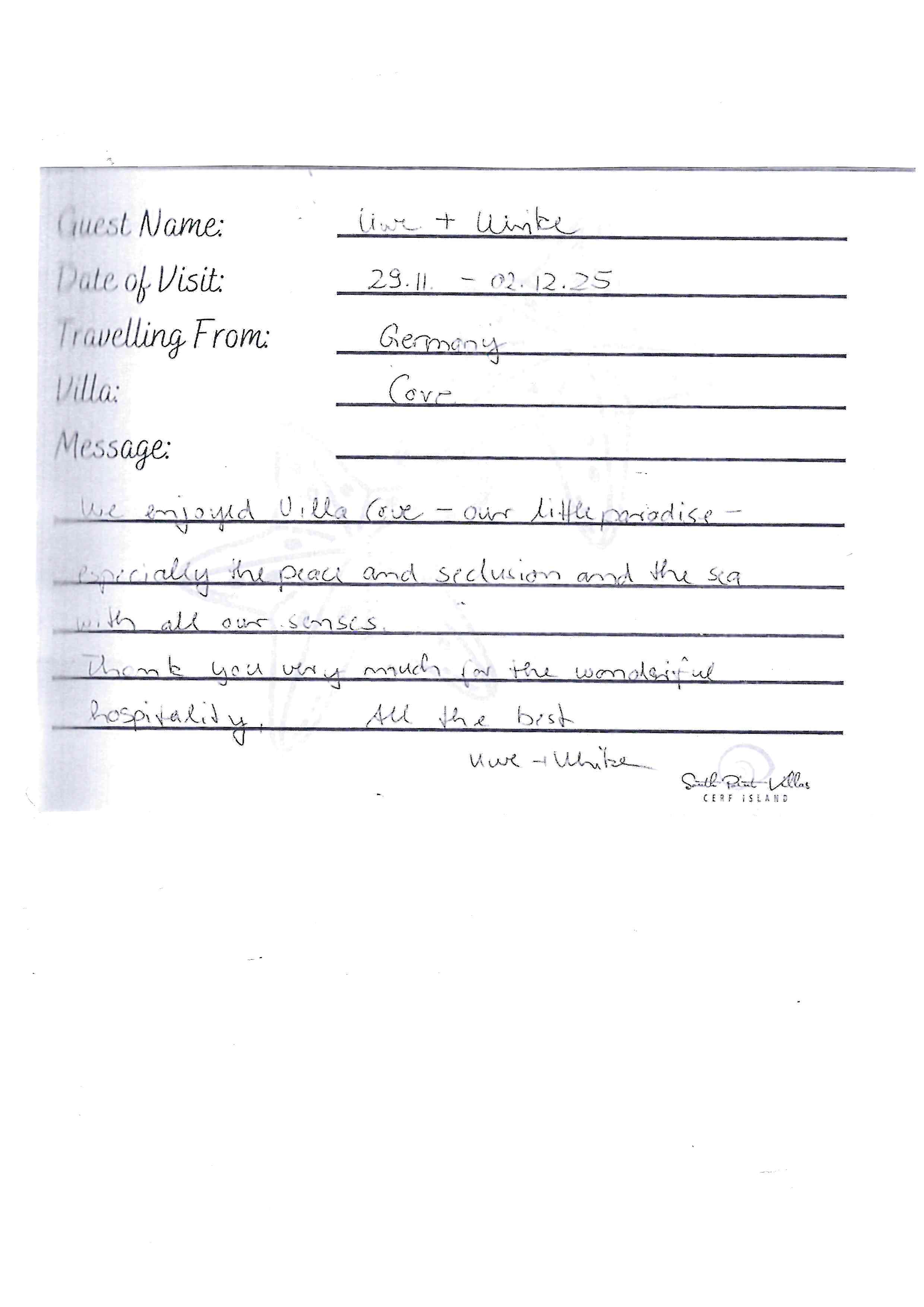 Lire l'entrée manuscrite du livre d'orWe enjoyed villa Cove - our little paradise - especially the peace and seclusion and the sea with all our senses.
