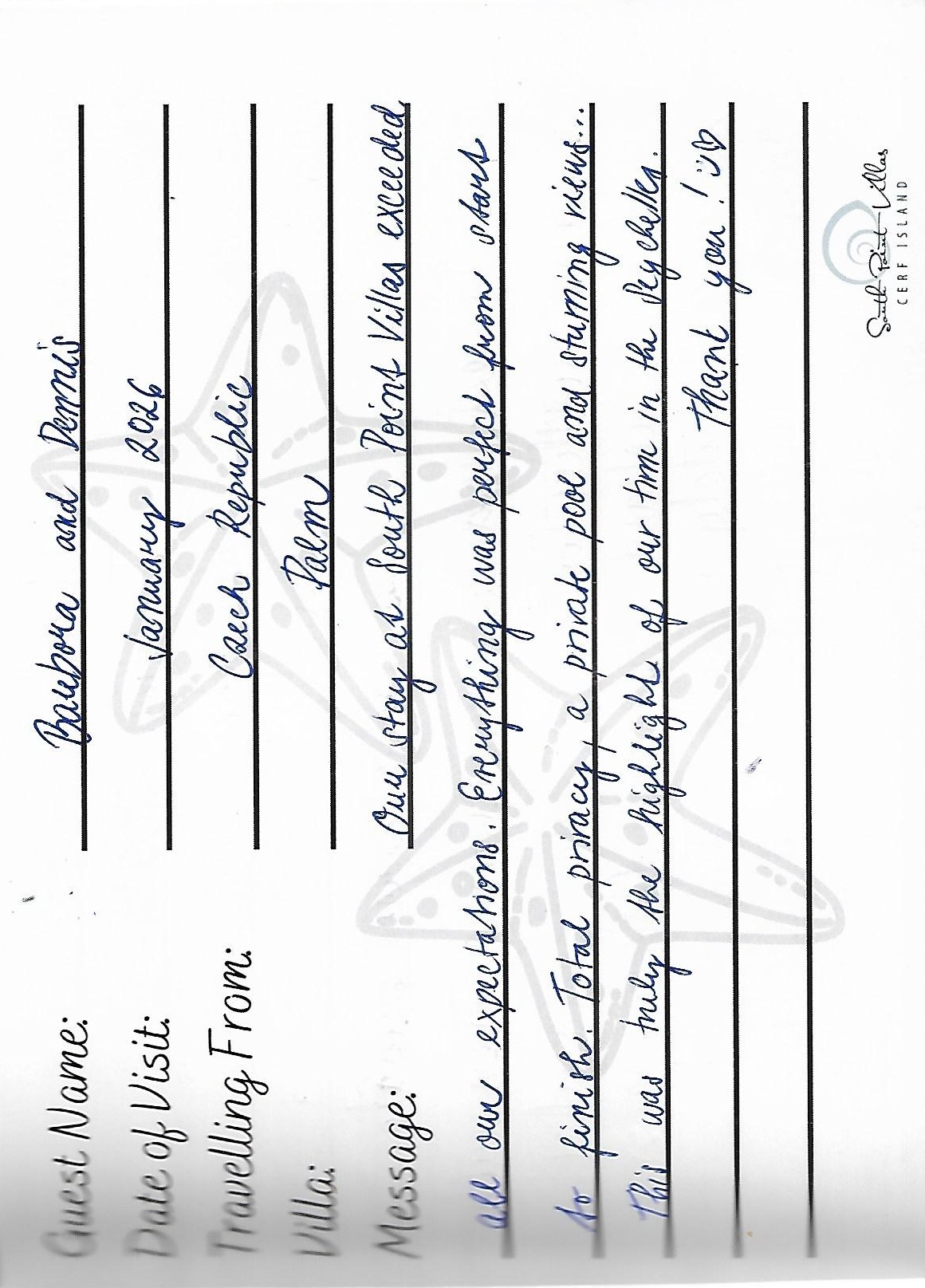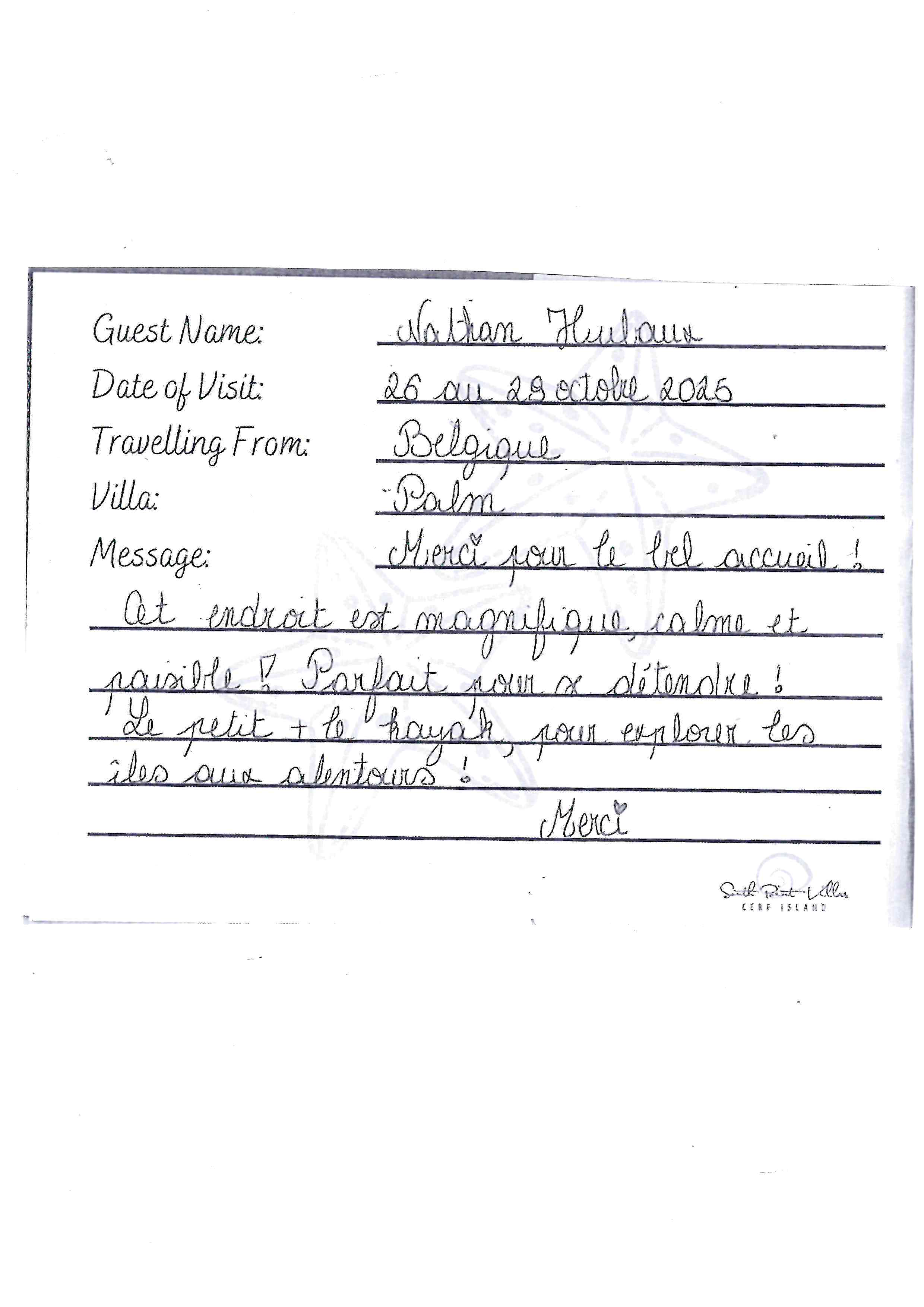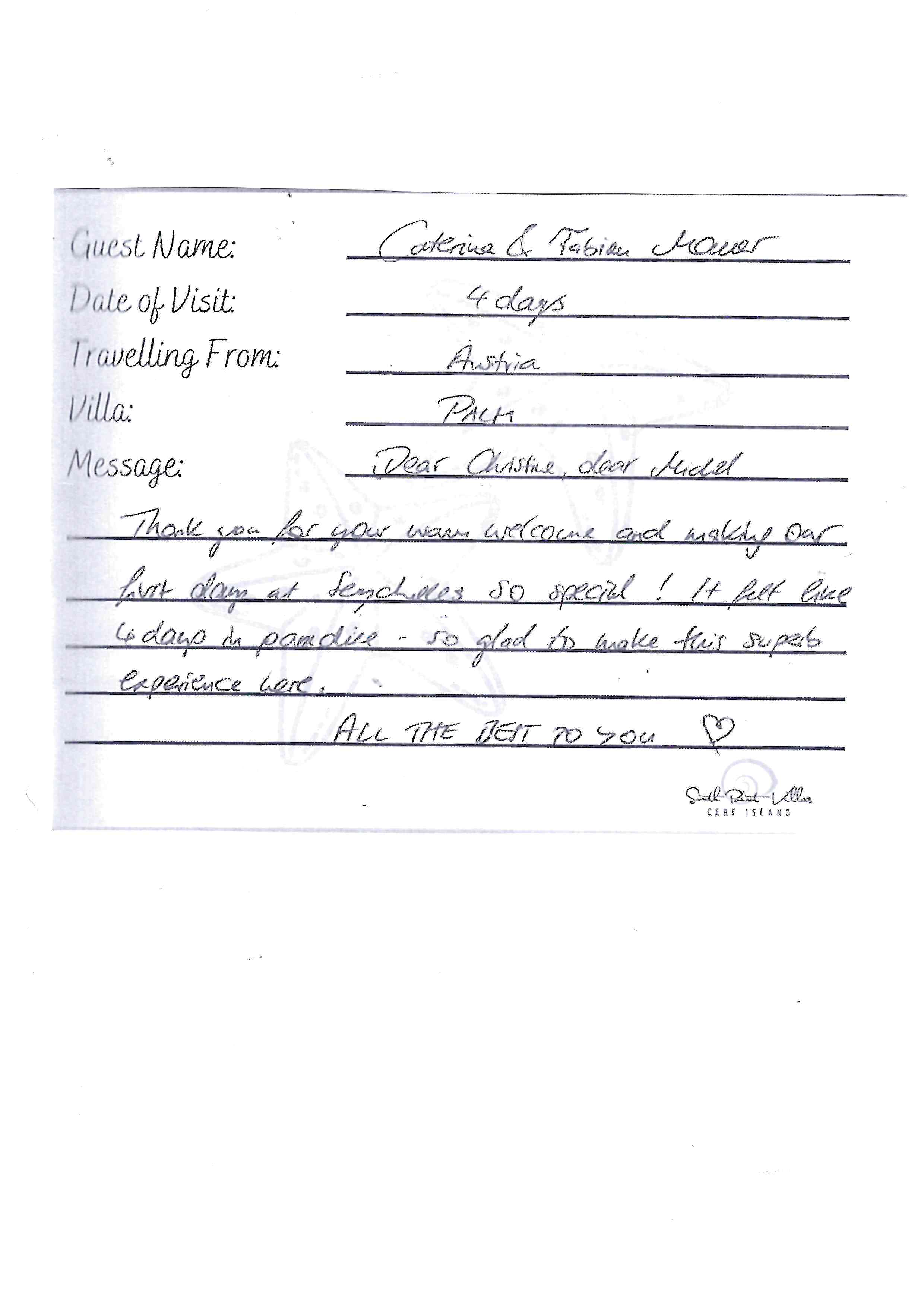 Lire l'entrée manuscrite du livre d'orThis place is a little piece of paradise on eath, we loved everything about Cerf Island and South Point Villas.