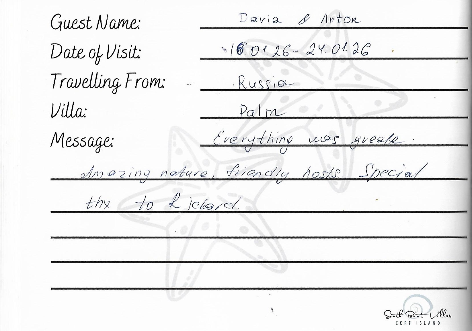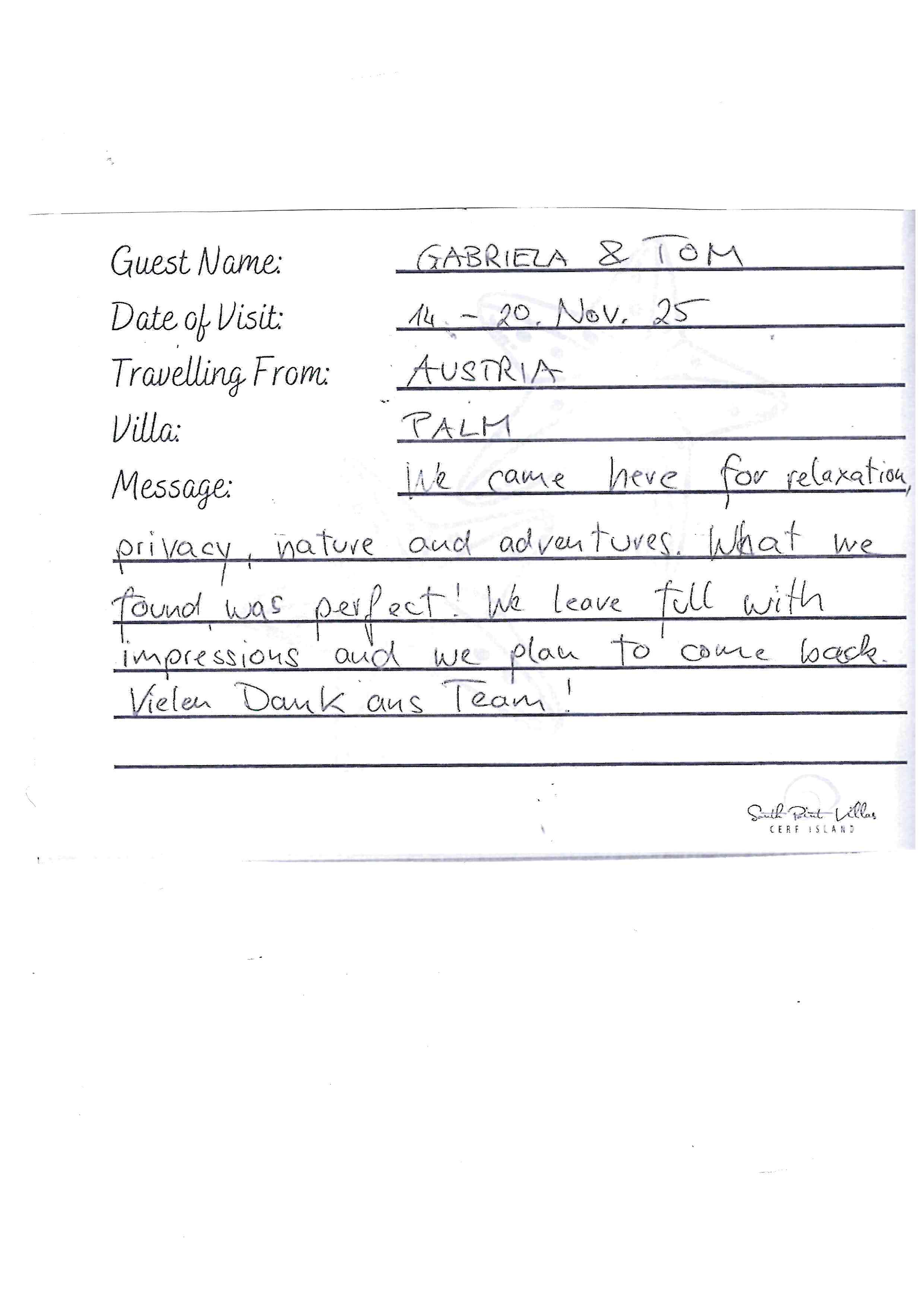 Lire l'entrée manuscrite du livre d'orBonjour Christin & Michel, peace in heaven and we are pretty sure, also here of Cerf Island, South Point Villa.